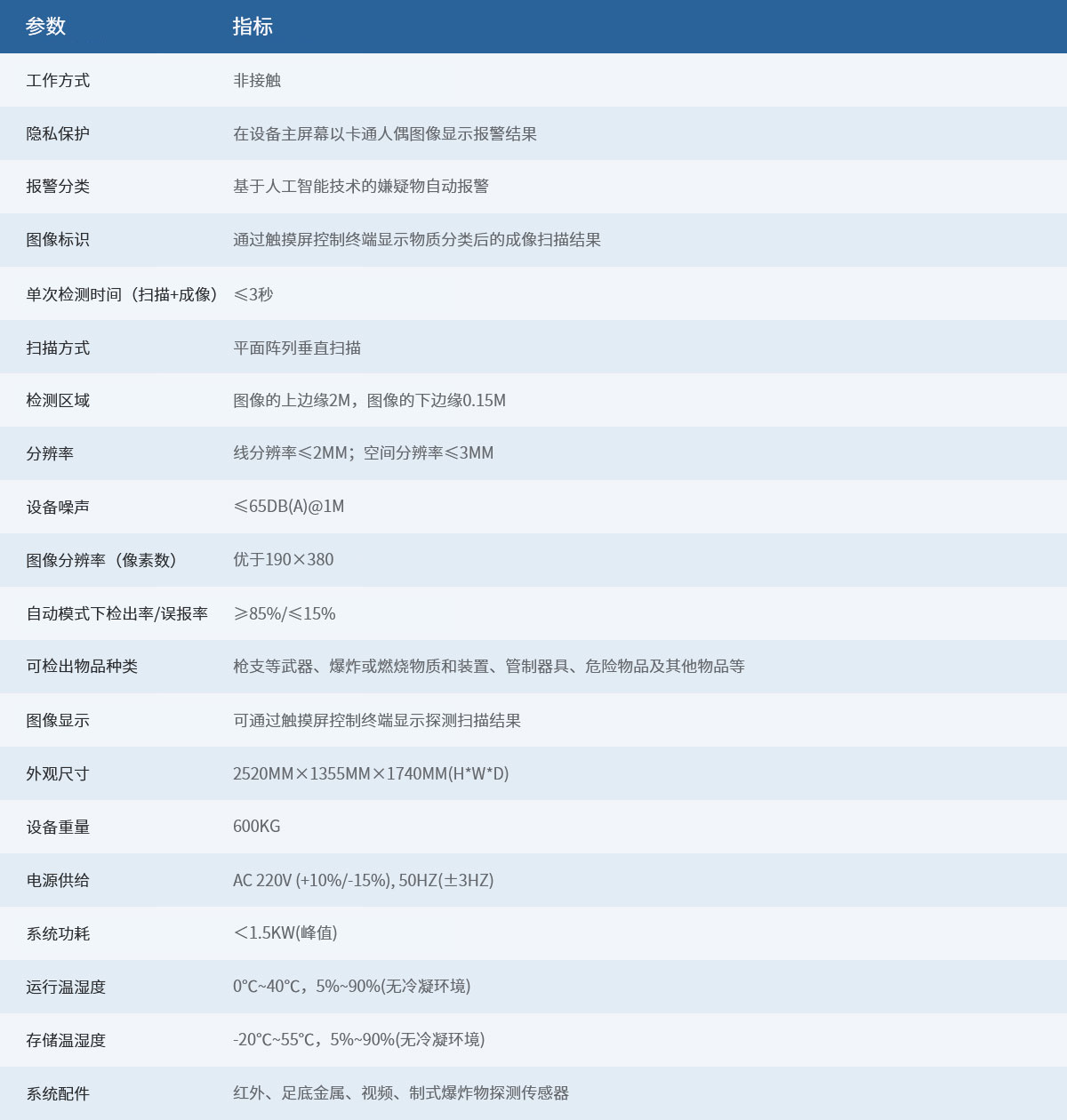 以安检门的方式对人体携带的金属和非金属物质进行可靠、安全、高效、多任务、智能化的检测,对检测标的自动识别、定位、分类并做出响应,同时数据联网,可与其他设备联动控制。