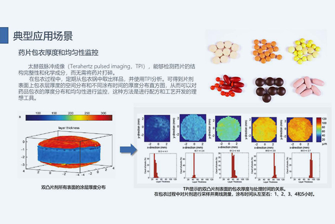 医药领域:药片缓释速度设计、药片包衣厚度和均匀性监控、药片核心完整性监控和双层药片压合效果监控等